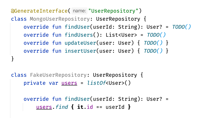 The idea behind annotation processing is quite simple: we define classes called processors that analyze our source code and generate additional files that typically also include code; however, these processors themselves don’t modify existing code. As an example, I will implement a simple library based on the idea of a friend of mine. I’ve never used it in any project, but it is simple enough to serve as a great example. To understand the idea, let's see the problem first. For many classes, we define interfaces primarily to make it easier to define fake variants of these classes for unit testing. Consider the MongoUserRepository below, which implements the UserRepository interface with a fake FakeUserRepository for unit tests.