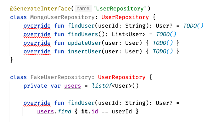 @GenerateInterface("UserRepository") class MongoUserRepository : UserRepository { override fun findUser(userId: String): User? = TODO() override fun findUsers(): List<User> = TODO() override fun updateUser(user: User) { TODO() } override fun insertUser(user: User) { TODO() } } class FakeUserRepository : UserRepository { private var users = listOf<User>() override fun findUser(userId: String): User? = users.find { it.id == userId } override fun findUsers(): List<User> = users override fun updateUser(user: User) { val oldUsers = users.filter { it.id == user.id } users = users - oldUsers + user } override fun insertUser(user: User) { users = users + user } }