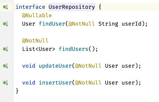 Note that for our UserRepository to work, the project needs to be built. In a newly opened project, or immediately after adding the GenerateInterface annotation, the interface will not yet have been generated and our code will look like it is not correct.