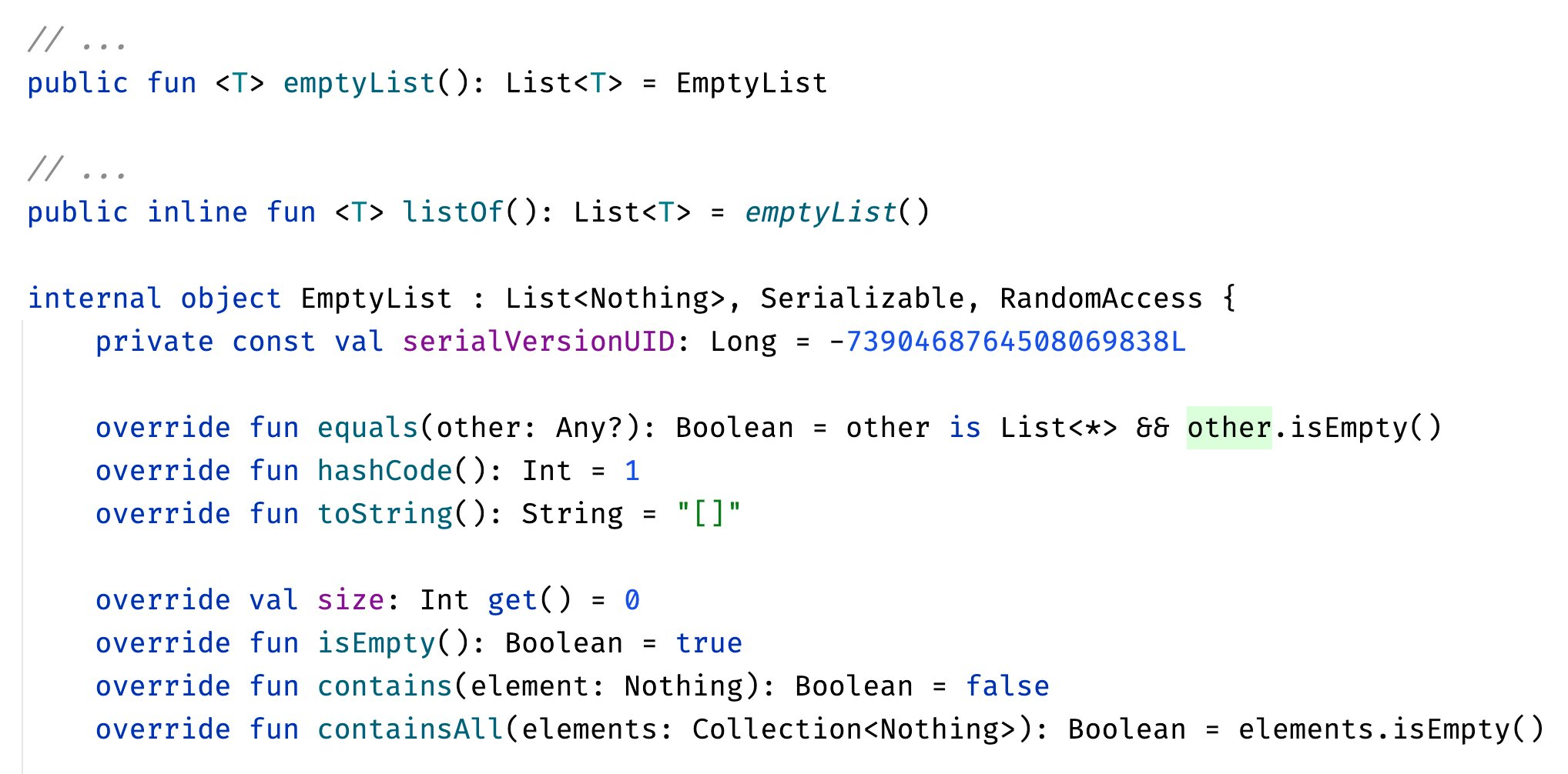 fun main() { val empty: List<Nothing> = emptyList() val strs: List<String> = empty val ints: List<Int> = empty val other: List<Char> = emptyList() println(empty === other) // true }