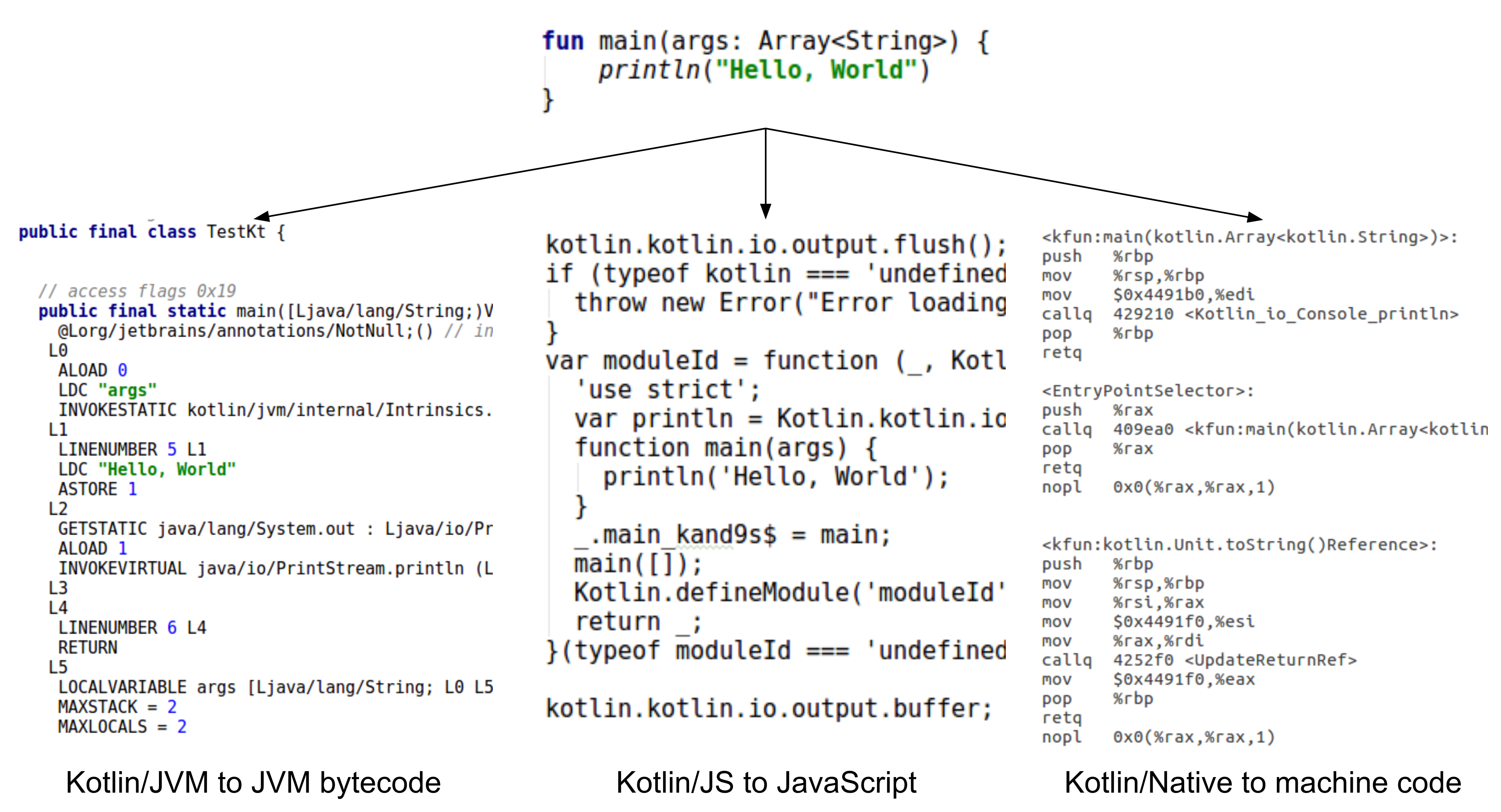 Kotlin is a compiled programming language, which means you can write some code in Kotlin and then use the Kotlin compiler to produce code in another language. Kotlin can currently be compiled into JVM bytecode (Kotlin/JVM), JavaScript (Kotlin/JS), or machine code (Kotlin/Native). This is why we say Kotlin is a multiplatform language: the same Kotlin code can be compiled to multiple platforms.