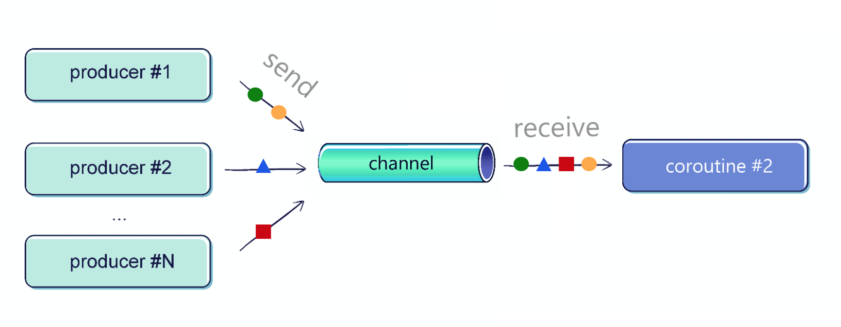 fun <T> CoroutineScope.fanIn( channels: List<ReceiveChannel<T>> ): ReceiveChannel<T> = produce { for (channel in channels) { launch { for (elem in channel) { send(elem) } } } }