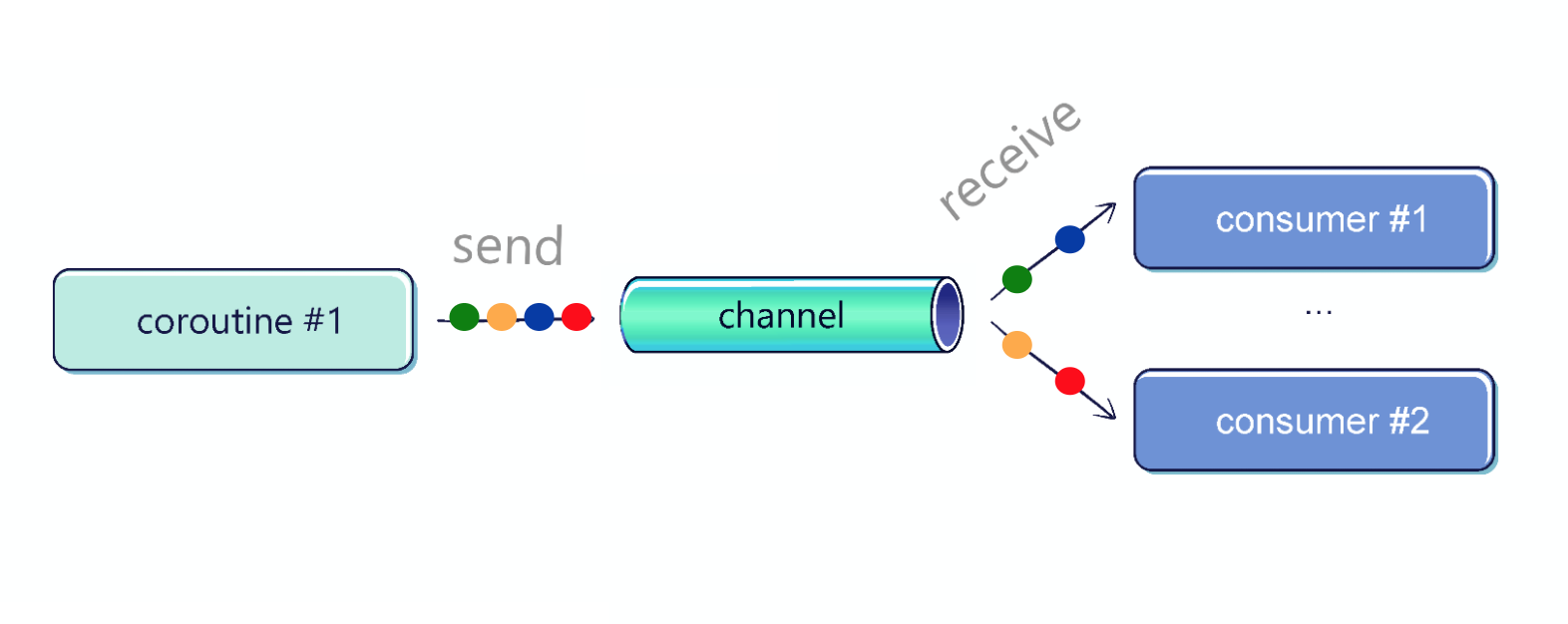 import kotlinx.coroutines.* import kotlinx.coroutines.channels.ReceiveChannel import kotlinx.coroutines.channels.produce //sampleStart fun CoroutineScope.produceNumbers() = produce { repeat(10) { delay(100) send(it) } } fun CoroutineScope.launchProcessor( id: Int, channel: ReceiveChannel<Int> ) = launch { for (msg in channel) { println("#$id received $msg") } } suspend fun main(): Unit = coroutineScope { val channel = produceNumbers() repeat(3) { id -> delay(10) launchProcessor(id, channel) } } // #0 received 0 // #1 received 1 // #2 received 2 // #0 received 3 // #1 received 4 // #2 received 5 // #0 received 6 // ... //sampleEnd