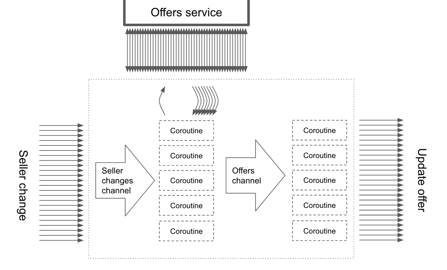 One solution to this problem is to set up a pipeline using channels. The first channel could contain the sellers to process, while the second one would contain the offers to be updated. These channels would have a buffer. The buffer in the second one could prevent our service from getting more offers when too many are already waiting. Thus, our server would be able to balance the number of offers we are updating at the same time.