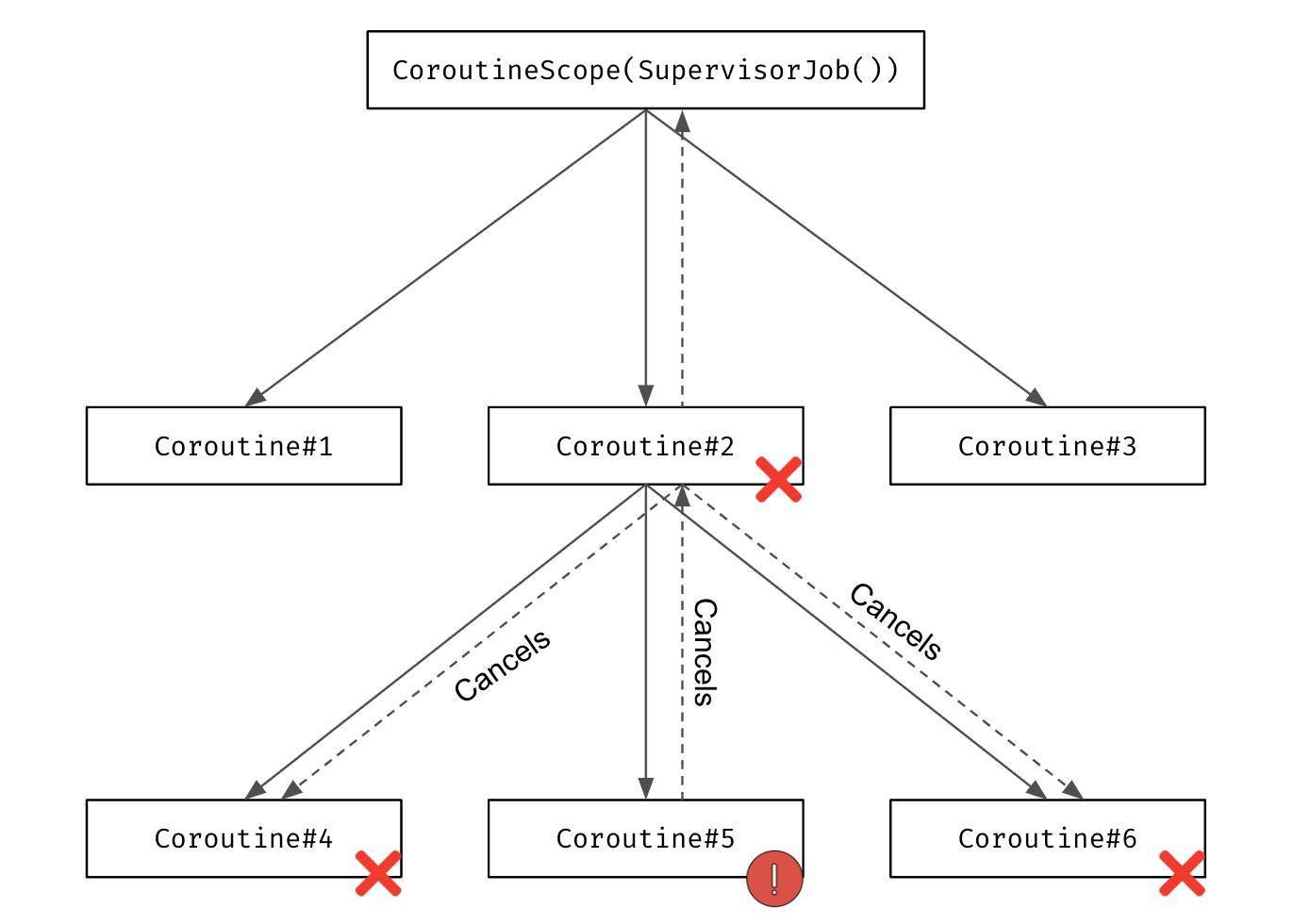 Cancellation of an asynchronous coroutine propagates to its parent, that treats it like its own exception. So it cancels its other children, and propagates it up to its parent. In this picture, Coroutine#6 has an exception, so it propagates Coroutine#3 and then to Coroutine#1. When those coroutines get cancelled, they cancel their children.