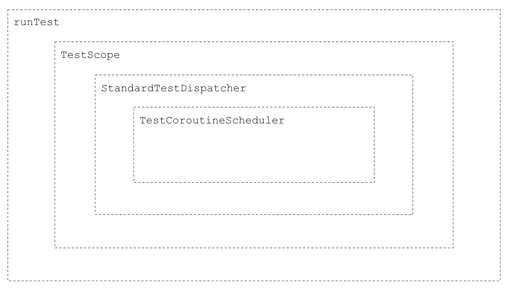 runTest includes TestScope, that includes StandardTestDispatcher, that includes TestCoroutineScheduler.