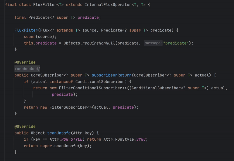 // Reactor's filter operator implementation public final Flux<T> filter(Predicate<? super T> p) { if (this instanceof Fuseable) { return onAssembly(new FluxFilterFuseable<>(this, p)); } return onAssembly(new FluxFilter<>(this, p)); } // To show it, I would need to insert not only the implementation of `onAssembly` // but also the implementation of `FluxFilter` and `FluxFilterFuseable`, which // are both very long and complex classes.