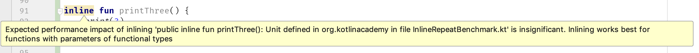 On my machine, the first one takes 30 ms, while the second takes 274 ms. This is due to the accumulated effects of the fact that a function is an object and the local variable needs to be wrapped. These objects make tiny barriers that need to be overcome many times, again and again, and this makes a significant difference in the end. Since in most cases we don’t know how functions with parameters of functional types will be used, when we define a utility function with such parameters, for instance for collection processing, it is good practice to make it inline. This is why most extension functions with parameters of functional types in the stdlib are inline.