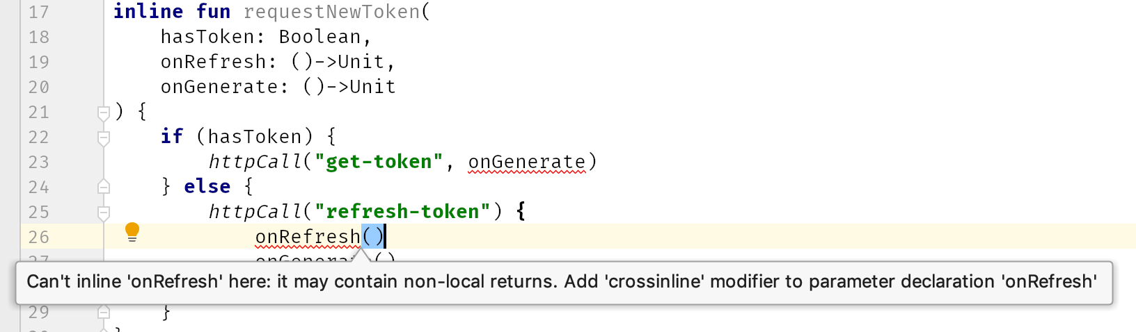 inline fun requestNewToken( hasToken: Boolean, crossinline onRefresh: () -> Unit, noinline onGenerate: () -> Unit ) { if (hasToken) { httpCall("get-token", onGenerate) // We must use // noinline to pass function as an argument to a // function that is not inlined } else { httpCall("refresh-token") { onRefresh() // We must use crossinline to // inline function in a context where // non-local return is not allowed onGenerate() } } } fun httpCall(url: String, callback: () -> Unit) { /*...*/ }