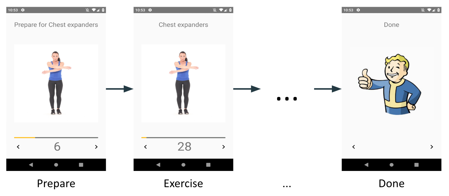 sealed class WorkoutState class PrepareState( val exercise: Exercise ) : WorkoutState() class ExerciseState( val exercise: Exercise ) : WorkoutState() object DoneState : WorkoutState() fun List<Exercise>.toStates(): List<WorkoutState> = flatMap { exercise -> listOf( PrepareState(exercise), ExerciseState(exercise) ) } + DoneState class WorkoutPresenter( /*...*/) { private var state: WorkoutState = states.first() //... }