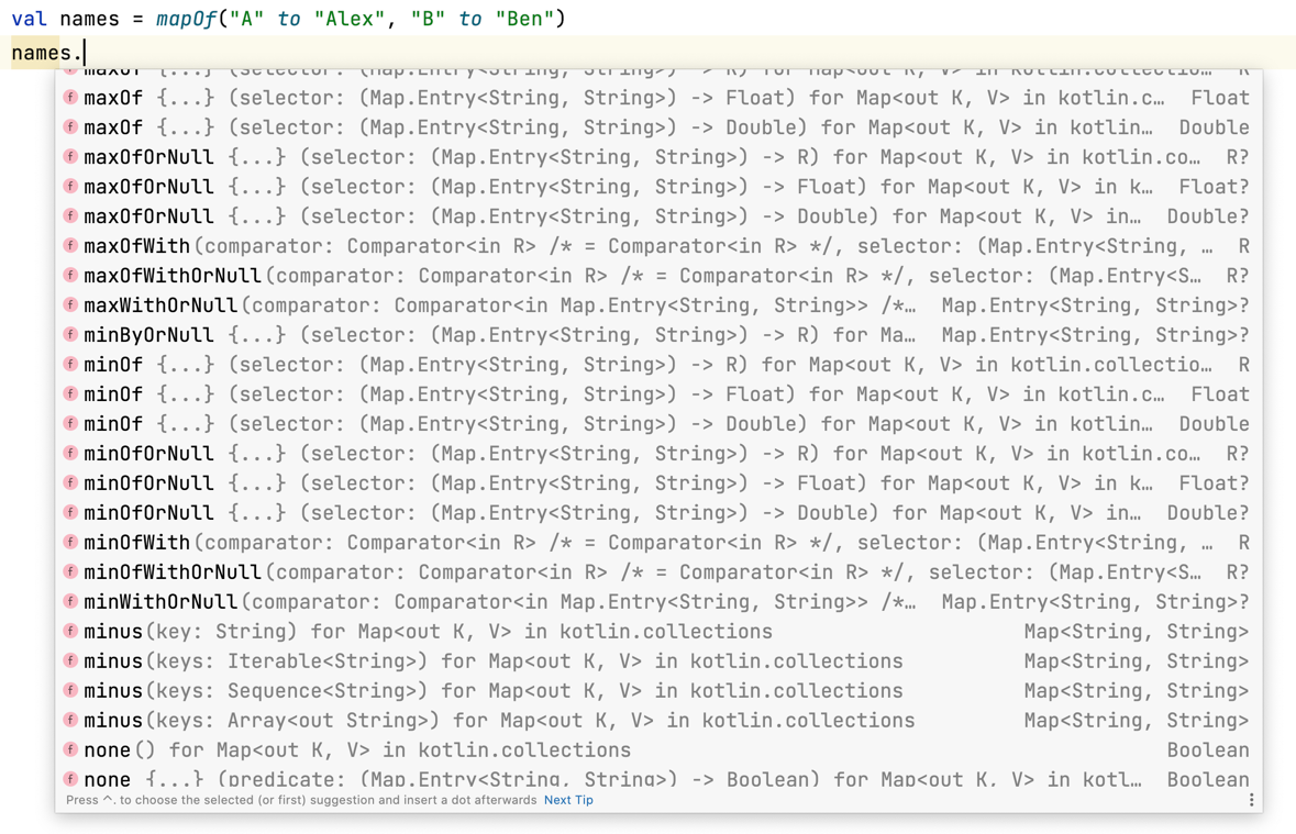 Most of the presented functions are extensions on either Collection or on Iterable, therefore they can be used not only on lists but also on sets. However, in addition to List and Set, there is also the third most important data structure: Map. It does not implement Collection or Iterable, so it needs custom collection processing functions. It has them! Most of the functions we have covered so far are also defined for the Map interface.