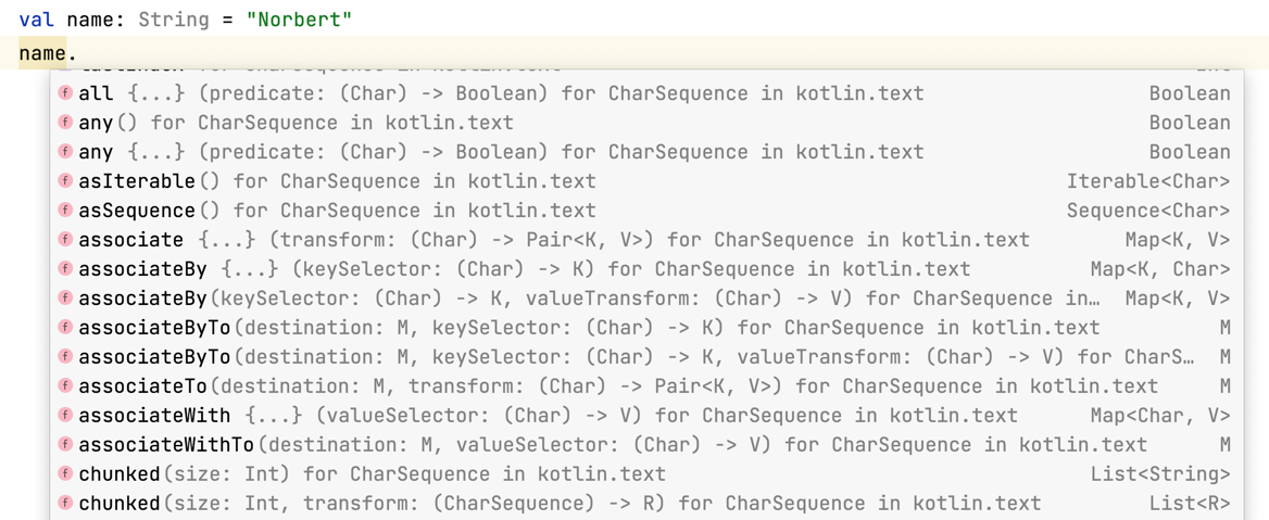 String is another important type. It is considered a collection of characters, but it does not implement Iterable or Collection. However, to support string processing, most collection processing functions are also implemented for String. However, String also supports many other operations, but these are better explained in the third part of the Kotlin for developers series: Advanced Kotlin.