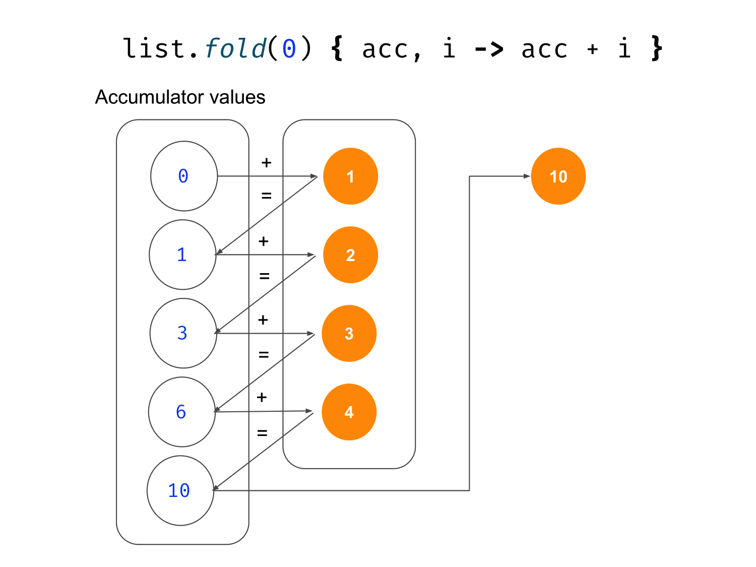 As you can see, fold(0) { acc, i -> acc + i } calculates the sum of all the numbers.