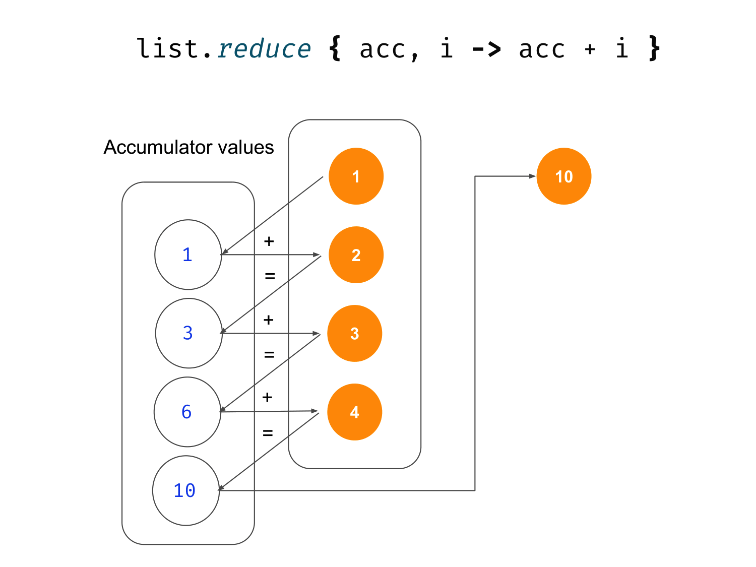 fun main() { val numbers = listOf(1, 2, 3, 4) val sum = numbers.fold(0) { acc, i -> acc + i } println(sum) // 10 val joinedString = numbers.fold("") { acc, i -> acc + i } println(joinedString) // 1234 val product = numbers.fold(1) { acc, i -> acc * i } println(product) // 24 }