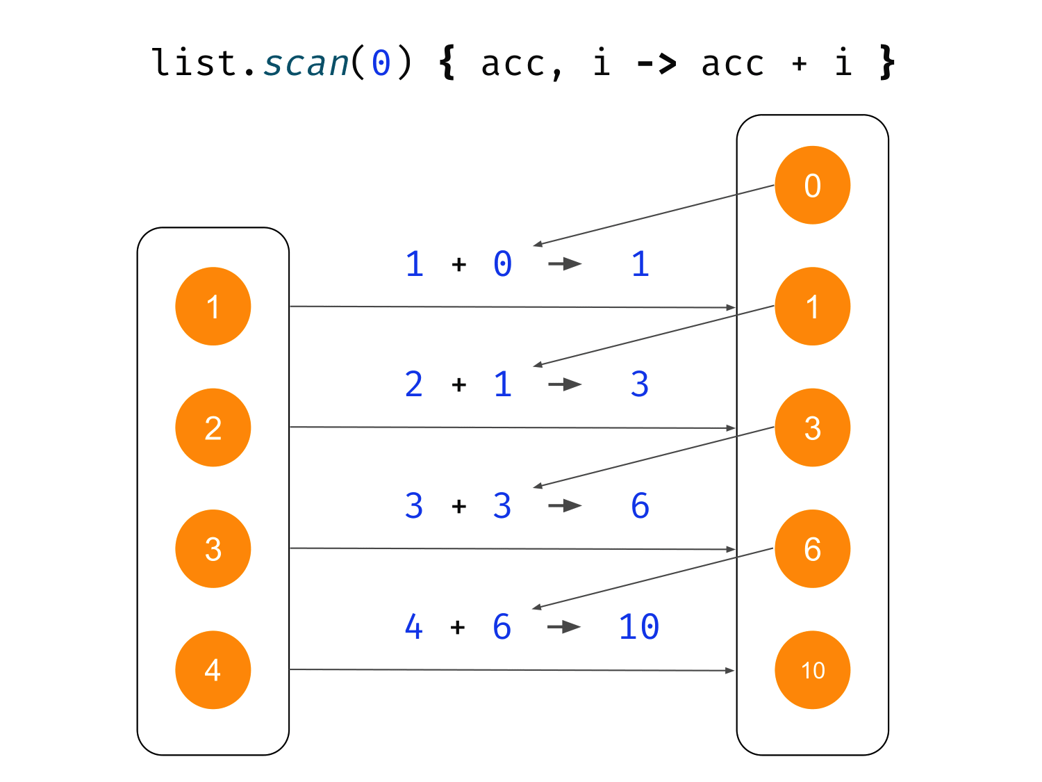 fun main() { val numbers = listOf(1, 2, 3, 4) println(numbers.fold(0) { acc, i -> acc + i }) // 10 println(numbers.scan(0) { acc, i -> acc + i }) // [0, 1, 3, 6, 10] println(numbers.runningFold(0) { acc, i -> acc + i }) // [0, 1, 3, 6, 10] println(numbers.fold("") { acc, i -> acc + i }) // 1234 println(numbers.scan("") { acc, i -> acc + i }) // [, 1, 12, 123, 1234] println(numbers.runningFold("") { acc, i -> acc + i }) // [, 1, 12, 123, 1234] println(numbers.fold(1) { acc, i -> acc * i }) // 24 println(numbers.scan(1) { acc, i -> acc * i }) // [1, 1, 2, 6, 24] println(numbers.runningFold(1) { acc, i -> acc * i }) // [1, 1, 2, 6, 24] }