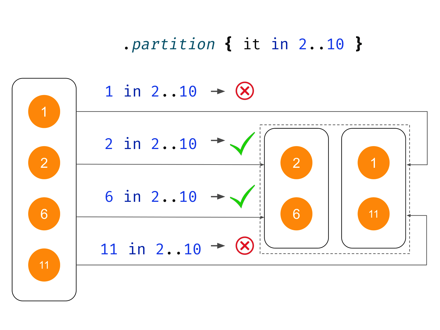 fun main() { val nums = listOf(1, 2, 6, 11) val partitioned: Pair<List<Int>, List<Int>> = nums.partition { it in 2..10 } println(partitioned) // ([2, 6], [1, 11]) val (inRange, notInRange) = partitioned println(inRange) // [2, 6] println(notInRange) // [1, 11] }