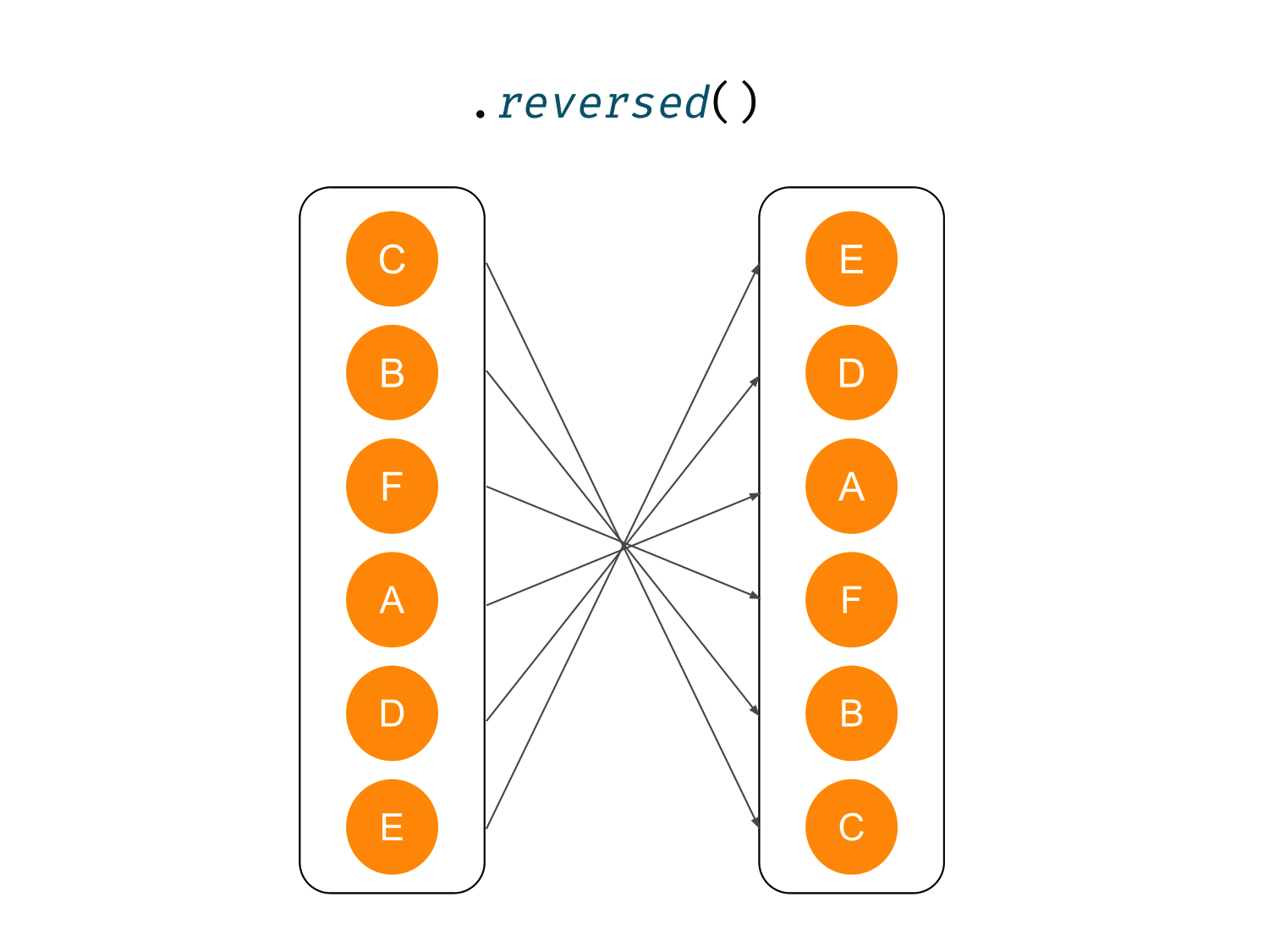 fun main() { println(listOf(4, 1, 3, 2).reversed()) // [2, 3, 1, 4] println(listOf('C', 'B', 'F', 'A', 'D', 'E').reversed()) // [E, D, A, F, B, C] }