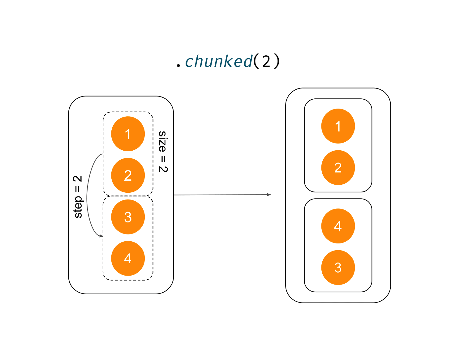 chunked divides our collection into chunks that are sub-collections of a certain size. It does not lose elements, so the last chunk might be smaller than the argument value.