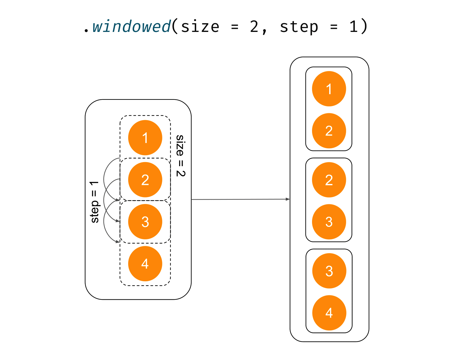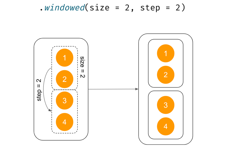 To connect adjacent elements into collections, the universal method is windowed, which returns a list of sublists of our list, where each is the next window of a given size. These sublists are made by sliding along this collection with the given step. In simpler words, you might imagine that windowed has a trolley of size size that makes a snapshot (a copy) of the elements below it and then makes a step of size step. When the end of the trolley falls off the collection, the process ends. However, suppose partialWindows is set to true. In that case, our trolley needs to fully fall off the collection for the process to stop (with partialWindows for the process to stop, our trolley can extend past the end of the collection to include any remaining elements).