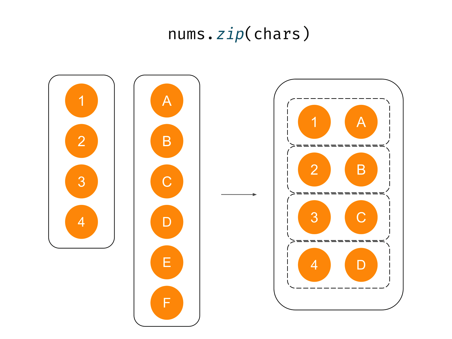 zip is used to connect two collections into one in a way that forms pairs of elements that are in the same positions. So, zip between List<T1> and List<T2> returns List<Pair<T1, T2>>. The result list ends when the shortest zipped collection ends.