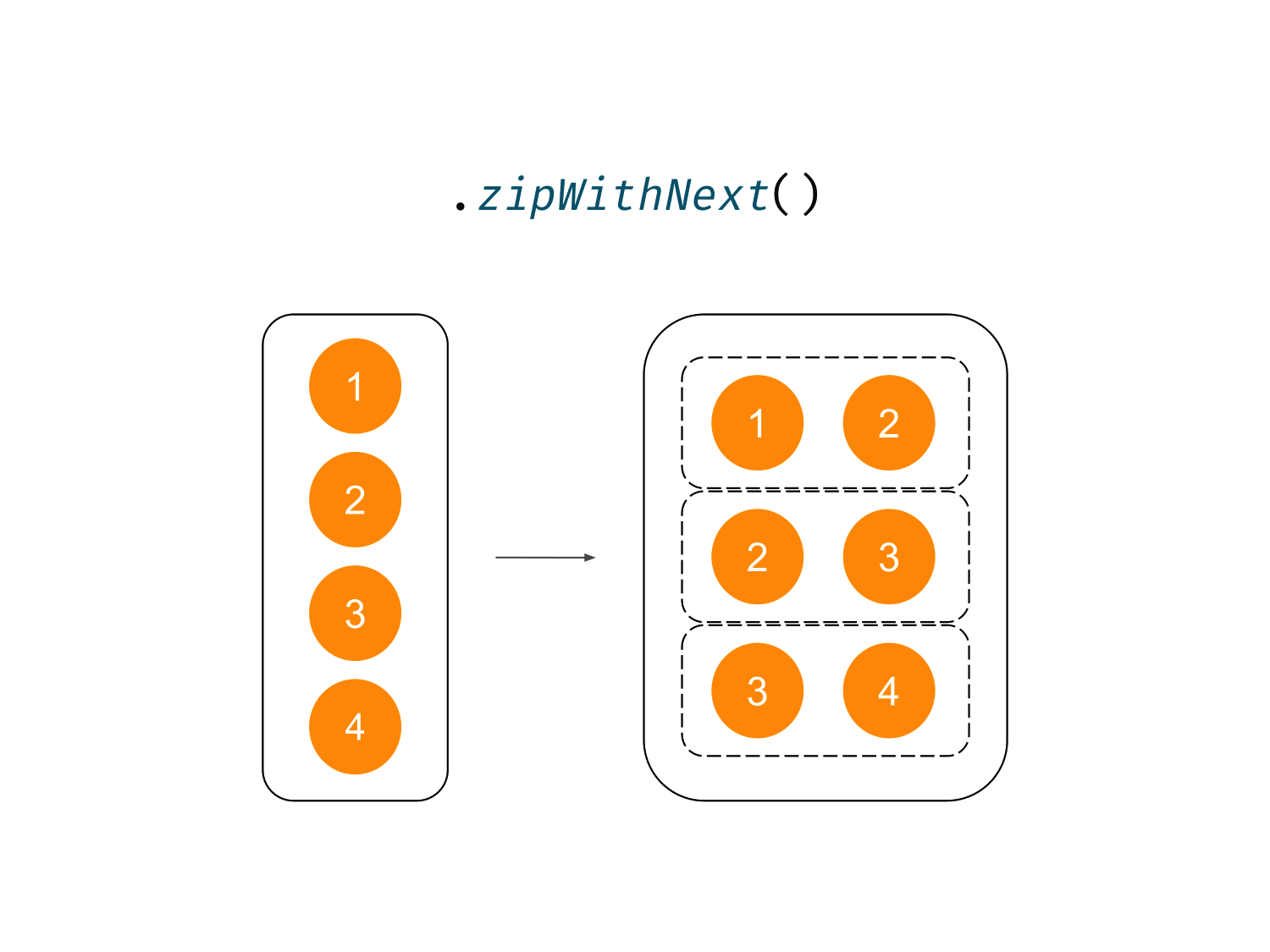 fun main() { println((1..4).zipWithNext()) // [(1, 2), (2, 3), (3, 4)] val person = listOf("Ashley", "Barbara", "Cyprian") println(person.zipWithNext()) // [(Ashley, Barbara), (Barbara, Cyprian)] }