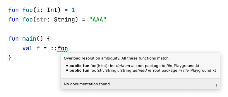 fun foo(i: Int) = 1 fun foo(str: String) = "AAA" fun main() { val fooInt: (Int) -> Int = ::foo println(fooInt(123)) // 1 val fooStr: (String) -> String = ::foo println(fooStr("")) // AAA }