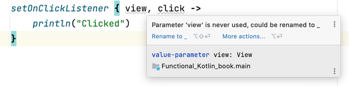 fun setOnClickListener(listener: (View, Click) -> Unit) {} fun main() { setOnClickListener({ view, click -> println("Clicked") }) }