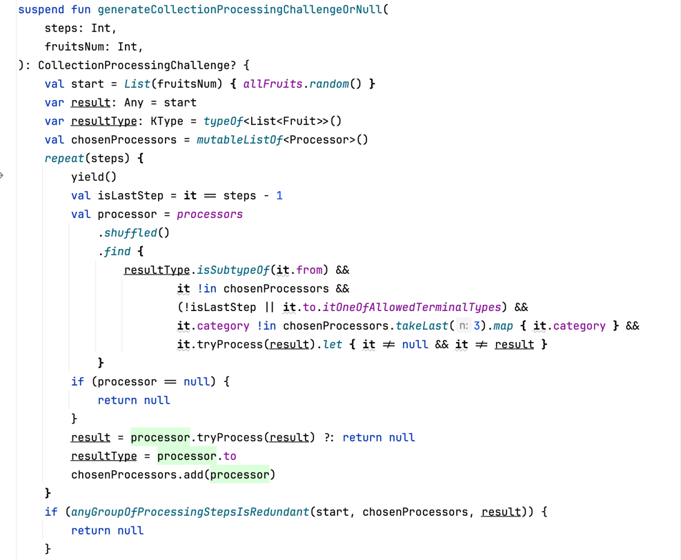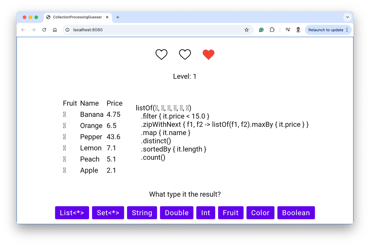 My next idea was to create a game, where player can see a list of fruits, and a set of collection processing functions, and the task is to guess the output of applying those functions to the list of fruits. The heart of this game is a generator of challenges. It turned out to be a complex function, using reflection a lot, but it wasn't the real challenge. I implemented it in a couple of hours, and it was really fun.
