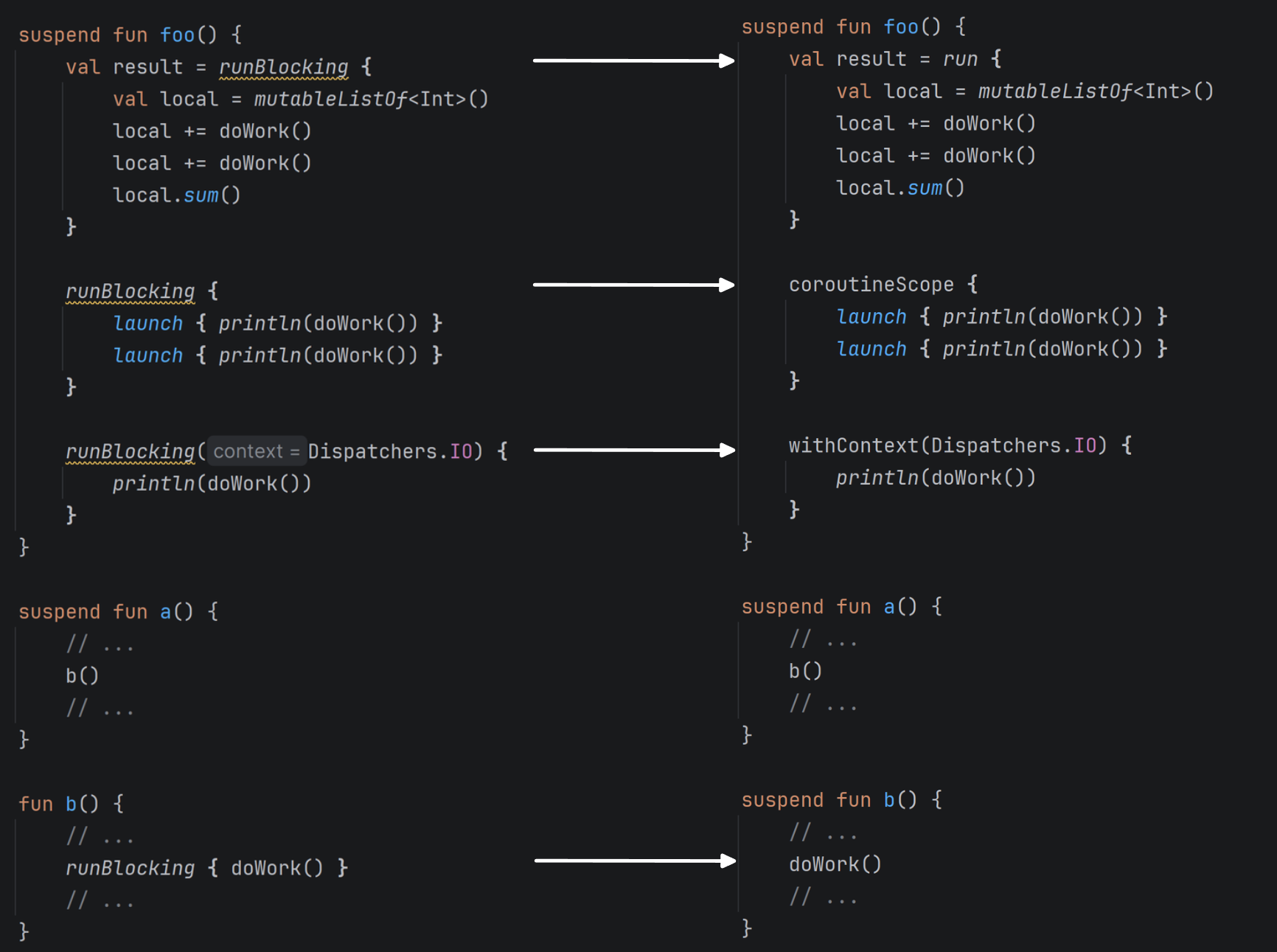 So what to use instead? That depends on what you want to achieve. In most cases, you just don’t need it. If you need to create a coroutine scope, use coroutineScope { … }. If you need to change context, use withContext(ctx) { … }. Beware situations where a suspending calls a regular function that uses runBlocking. Prefer making this function suspending to avoid making a blocking call.