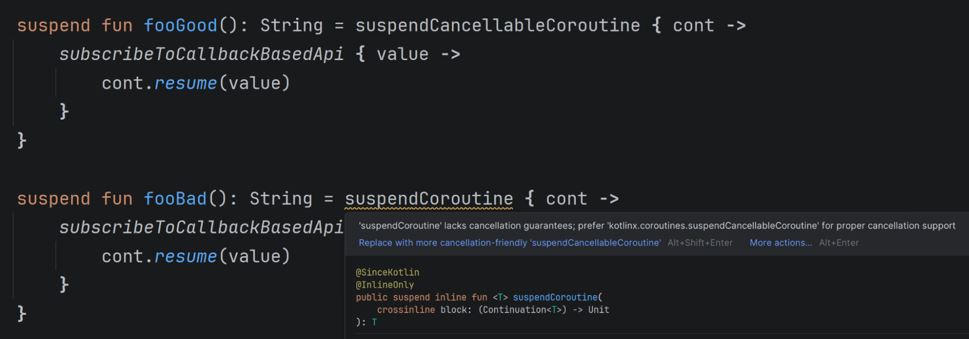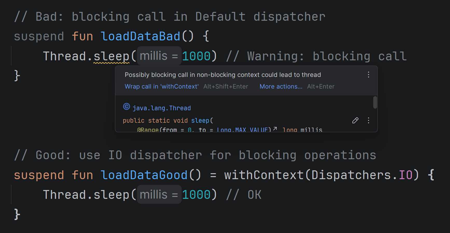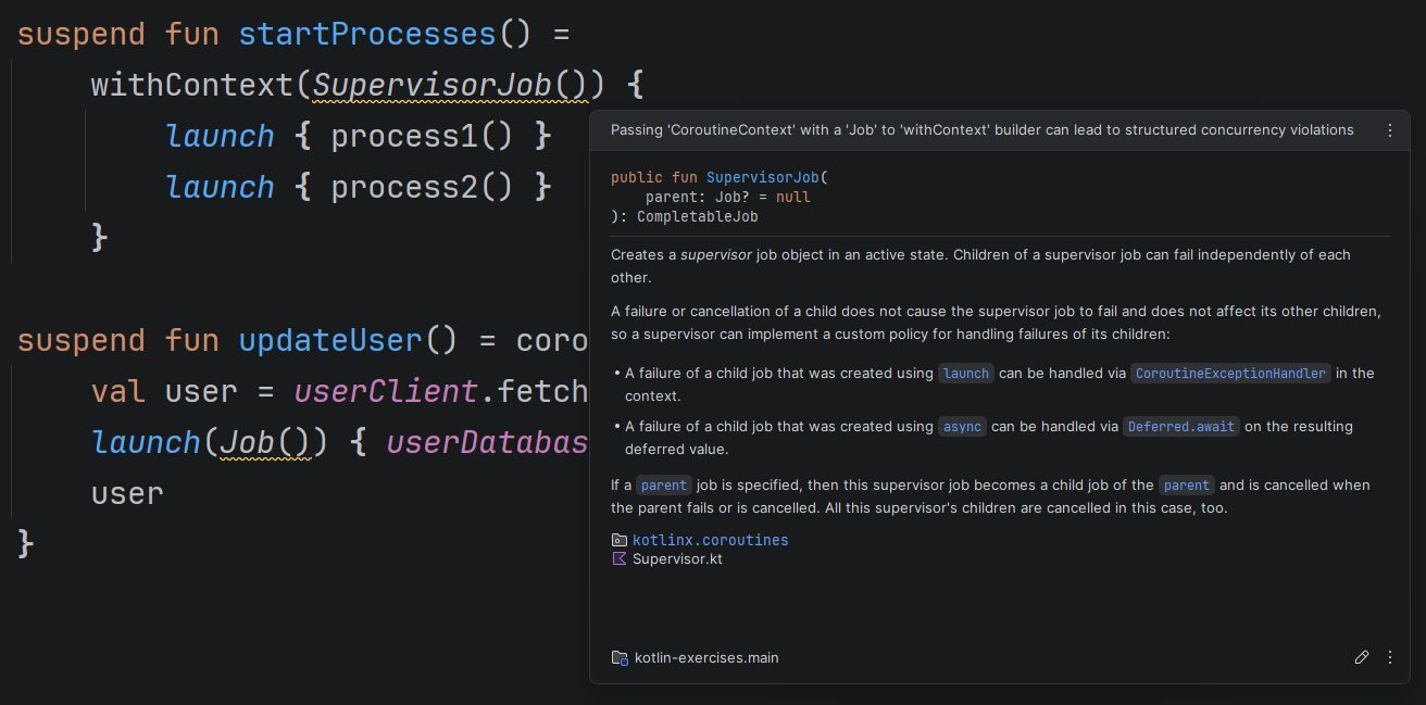 Today, I am delighted to announce that IntelliJ introduced a set of new, amazing warnings for the Kotlin coroutines library. I have seen those mistakes in many codebases and fought them by educating people through my books, articles, and workshops. I hope this article is my last explanation of why those patterns are wrong and what to do instead.
