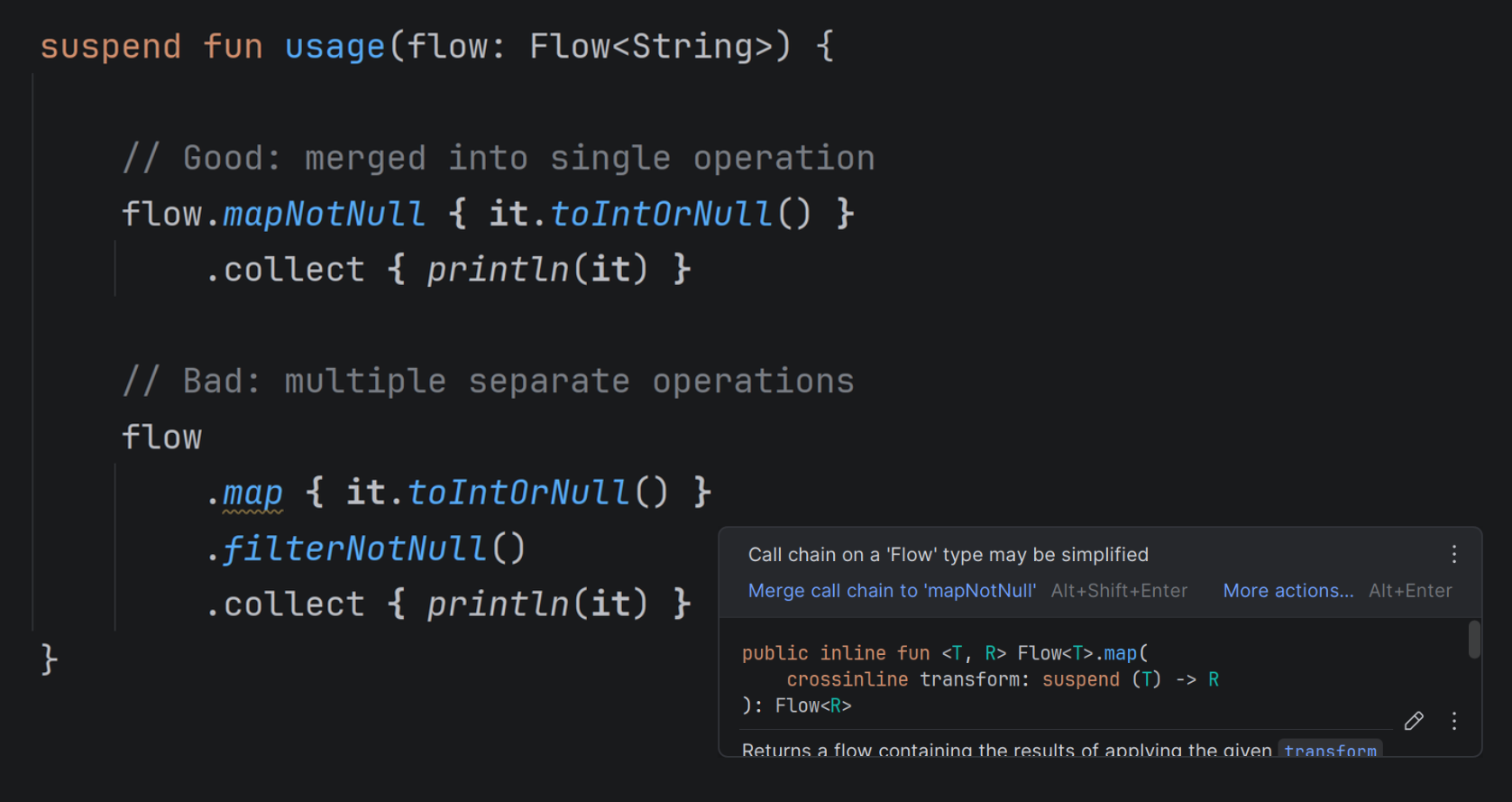 You surely know this one from collection or sequence processing: if you use filterNotNull after map, you have a suggestion to use mapNotNull, or if you use filter { it is T }, you have a suggestion to use filterNotNull<T>. Now the same suggestions are present for flows! Happy to see that as well.