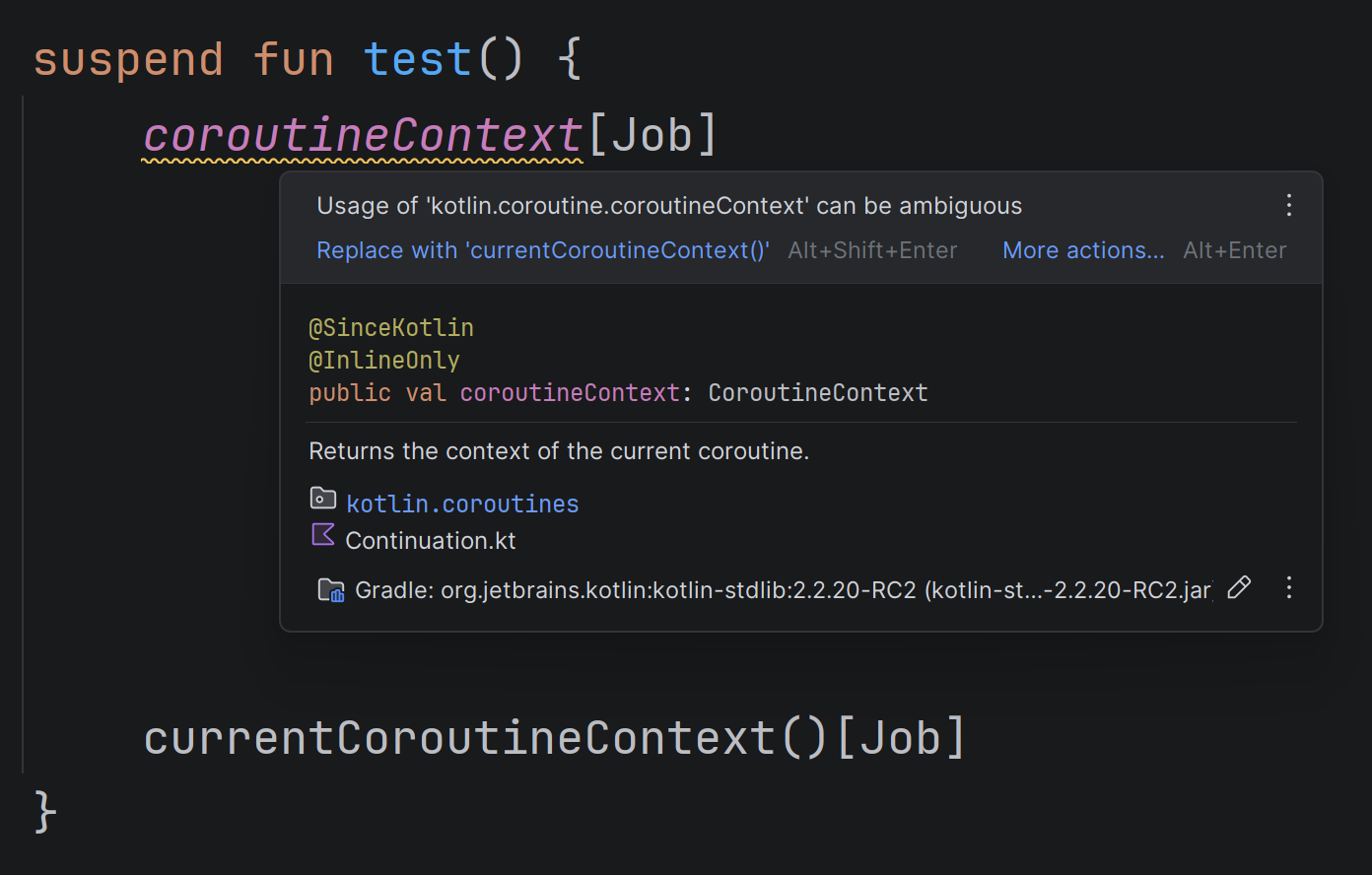 All suspending functions can access the context of the coroutine in which they are called. The original way to refer to it was the coroutineContext property. The problem with this property is that CoroutineScope, which is implicitly available in coroutine starters (launch, coroutineScope, runTest, etc), has a property with the same name. This name clash often caused confusion and issues. To understand why, consider the code below.