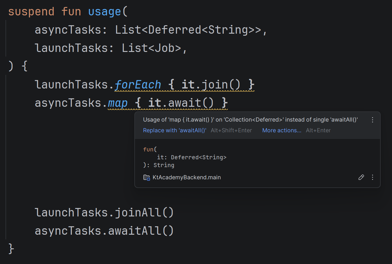 If you use map { it.await() } in code, you will see a suggestion to use awaitAll() instead. If you use forEach { it.join() }, you will see a suggestion to use joinAll() instead. Why? awaitAll() and joinAll() are cleaner. awaitAll() is also more efficient and better represents waiting for multiple tasks, as it waits for all elements rather than waiting for one after another.