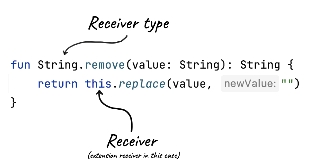 // explicit this fun String.remove(value: String) = this.replace(value, "") // implicit this fun String.remove(value: String) = replace(value, "")