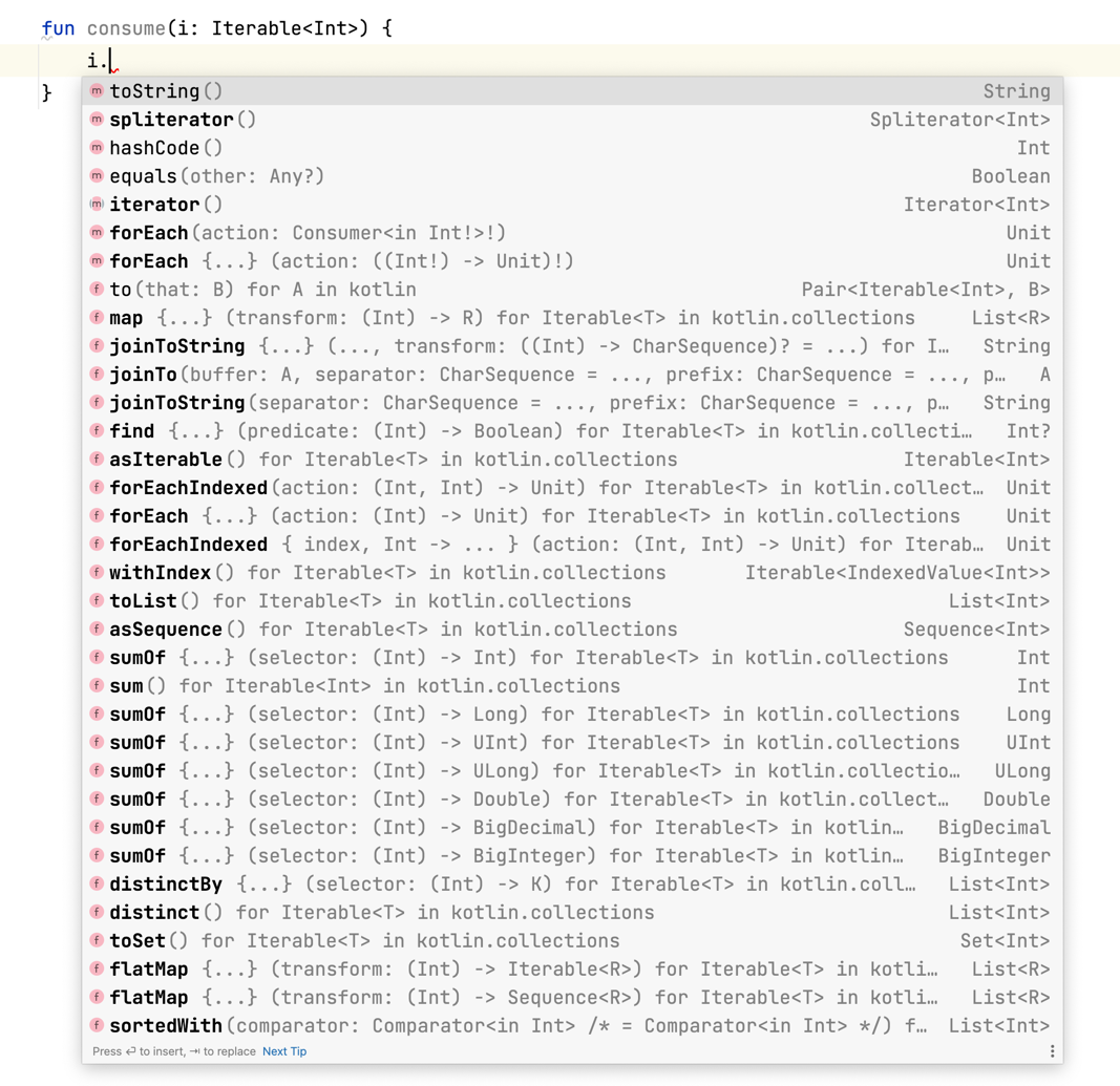 Extension functions are also more elastic than regular functions. This is mainly because they are defined on types, so we can define extensions on types like Iterable<Int> or Iterable<T>.