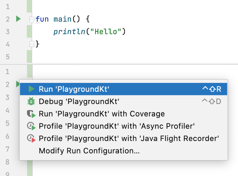 I also recommend you test this now. Open any Kotlin project (it is best if you have a dedicated project for playing with Kotlin), create a new file (you can name it "Test" or "Playground"), and create the main function with the live template “maina”. Use the print function with some text, and run the code with the Run button.