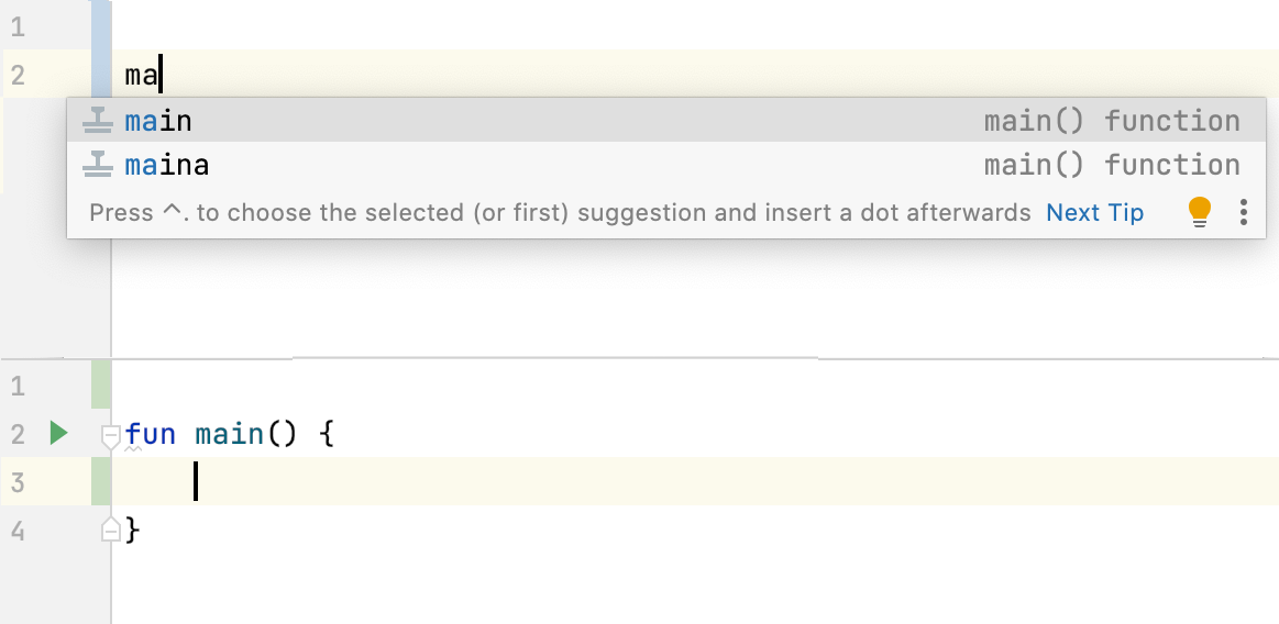 If you decide to test or practice the material from this book[^02_3], you will likely be writing the main function quite often. Here come live templates to help us. This is an IntelliJ feature that suggests using a template when you start typing its name in a valid context. So, if you start typing "main" or "maina" (for main with arguments) in a Kotlin file, you will be shown a suggestion that offers the whole main function.