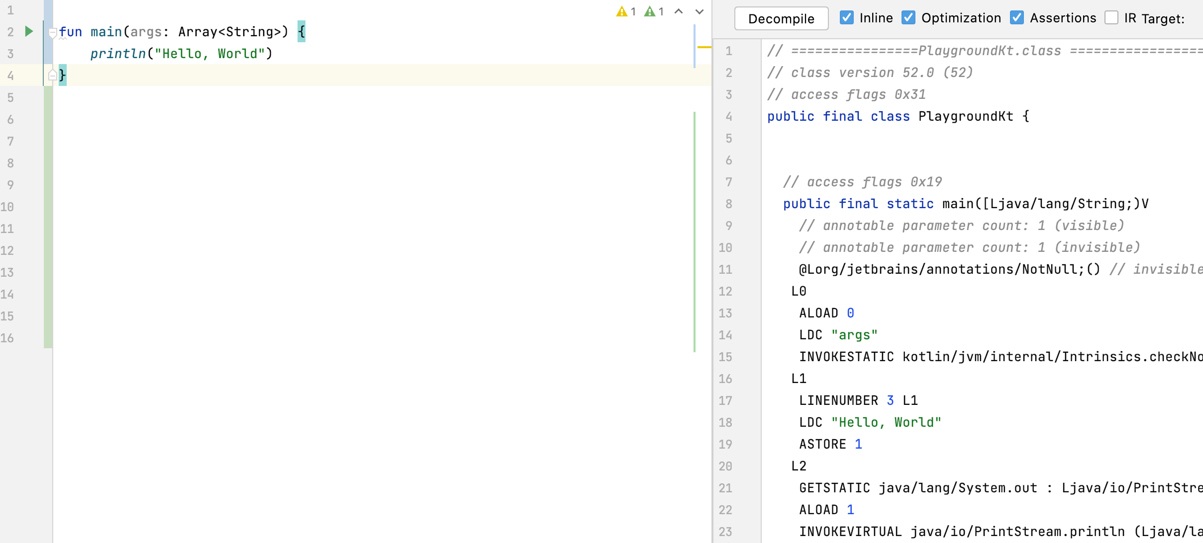 This is a great place for everyone who likes reading JVM bytecode. Since not everyone is Jake Wharton, most of us might find the "Decompile" button useful. What it does is quite funny. We’ve just compiled our Kotlin code into JVM bytecode, and this button decompiles this bytecode into Java. As a result, we can see what our code would look like if it were written in Java[^02_5].