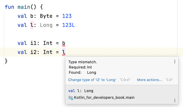 fun main() { val b: Byte = 123 val l: Long = 123L val i: Int = 123 val i1: Int = b.toInt() val i2: Int = l.toInt() val l1: Long = b.toLong() val l2: Long = i.toLong() }
