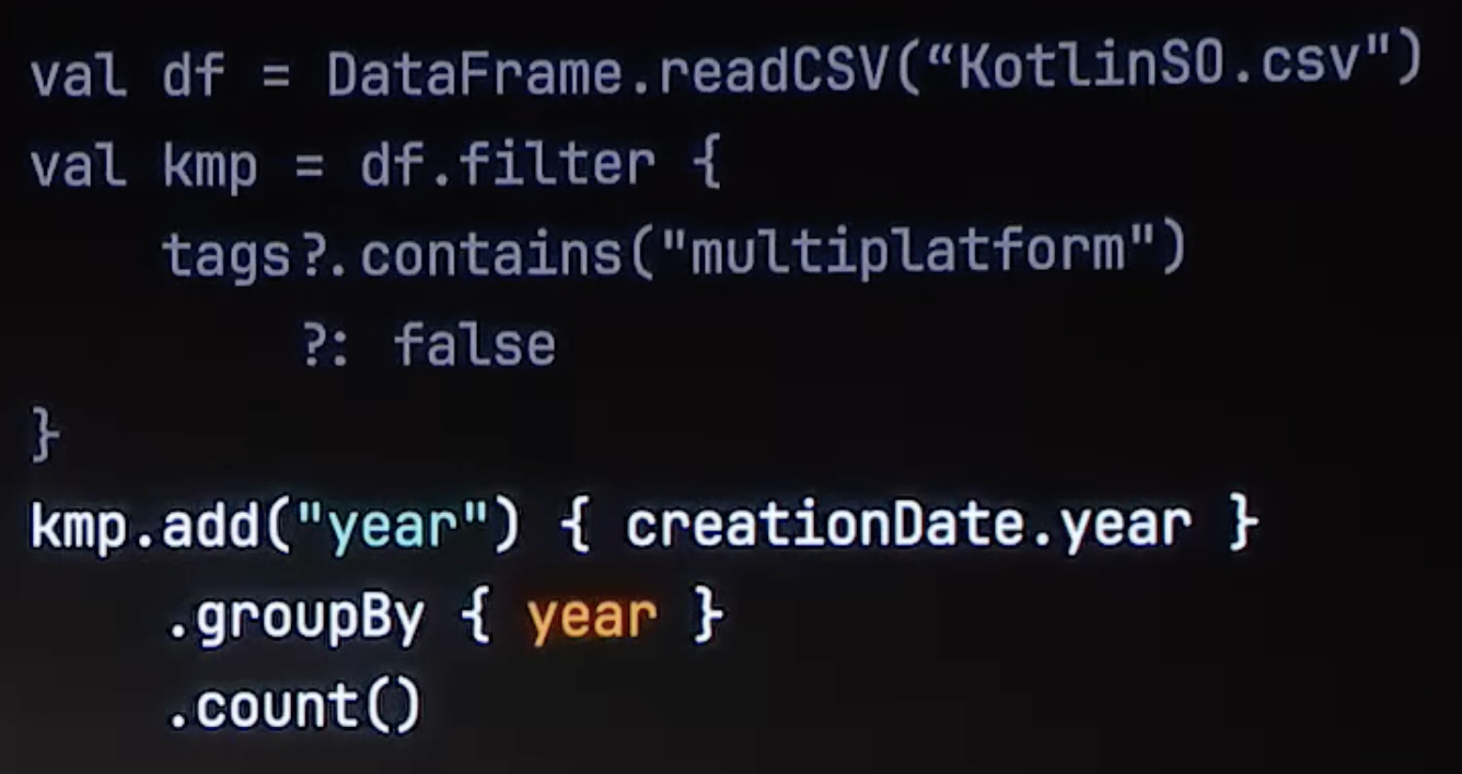 However, this might be about to change! Roman Elizarov showed on KotlinConf 2023 opening Keynote, that new Kotlin Compiler Plugin capabilities will allow type generation during development time. Consider the example below. Inside filter, we can reference tags because this is the name of one of columns in KotlinSO.csv. What is more, inside groupBy we can reference year property, because such colums was added a line before.