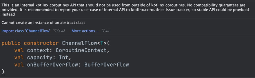 The ChannelFlow type is meant to be an internal type. How could we compose our flow in such a way to leverage the power of ChannelFlow, but having to declare our types using the generic FLow<T> type?