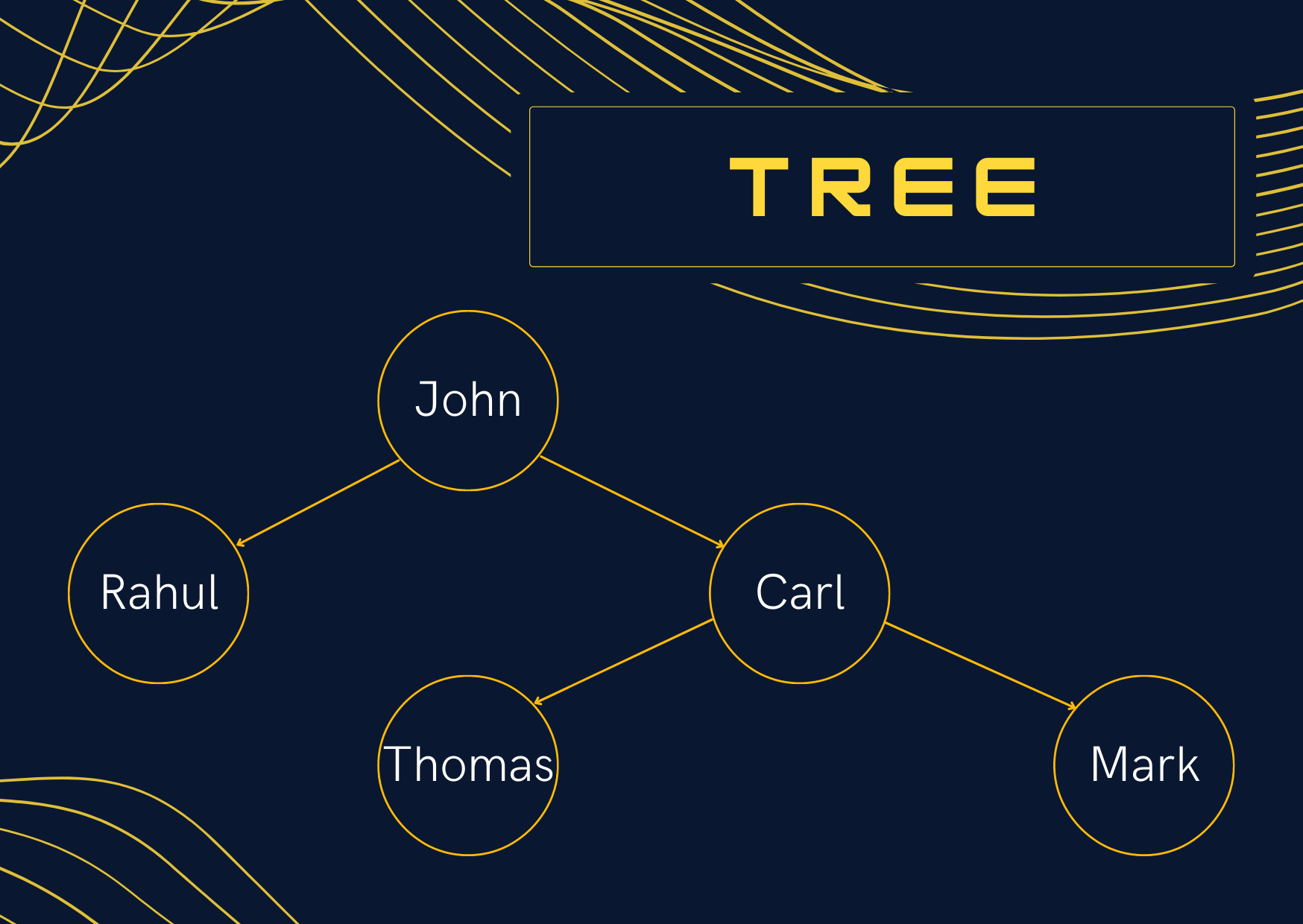 For example, the above tree shows the organizational hierarchy of a company. Here, John is the CEO of the company. Rahul and Carl directly report to John. Carl further has two direct reportees named Thomas and Mark.