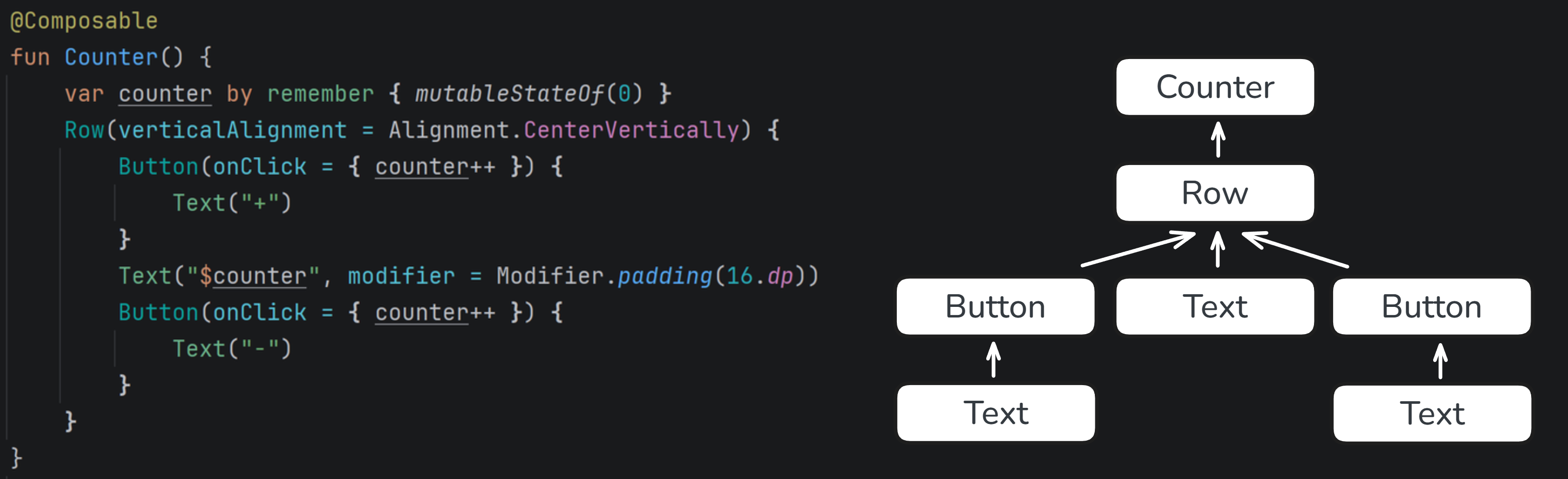 How is this view built based on the Counter function? When we start composition (using a function like setContent) its lambda is executed to build the UI tree in a process called composition (in this case, I use Compose on WASM, so ComposeViewport starts composition). Counter calls whatever is inside its body, so remember and Row. remember creates a state that persists recomposition and returns its reference. Row emits UI, so adds a node to our UI tree under Counter component. It also needs to get composed, so its lambda gets called. It includes Row, Button and Row children, so as those functions get called, they each emit their own nodes to the UI tree. This process continues recursively until all composables are executed and the whole UI tree is built.