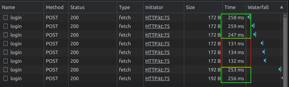 What we see here is that some responses take ~250ms and other responses take ~130ms.