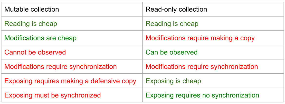 Now consider thread safety. Default mutable collections require synchronizing both their reads, copies, and modifications, because those are all non-atomic operations.