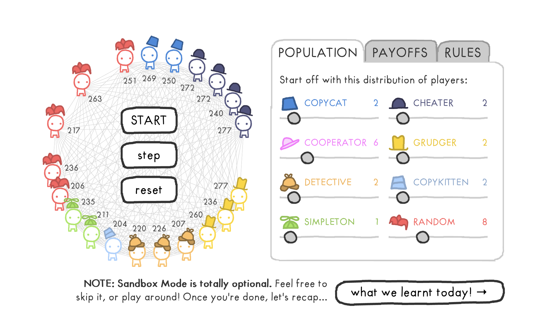 Gra autorstwa Nicka Case, dostępna na https://ncase.me/, wyjaśniająca czym jest teoria gier i czego nas uczy w różnych wydaniach — iteracyjnym, ewolucyjnym, itp.