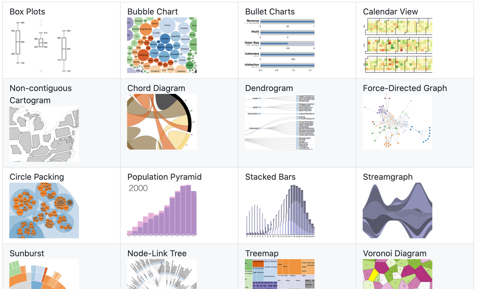 Różne typy wizualizacji danych z dokumentacji D3.js. Jest ich tam wiele, wiele więcej.