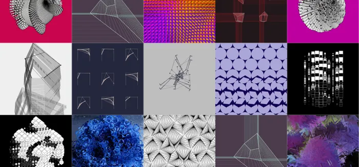 Przykłady sztuki stworzonej przy użyciu kodu, ze szkoły Interactive Architecture Lab. Faktyczne dzieła są często żywe i interaktywne.