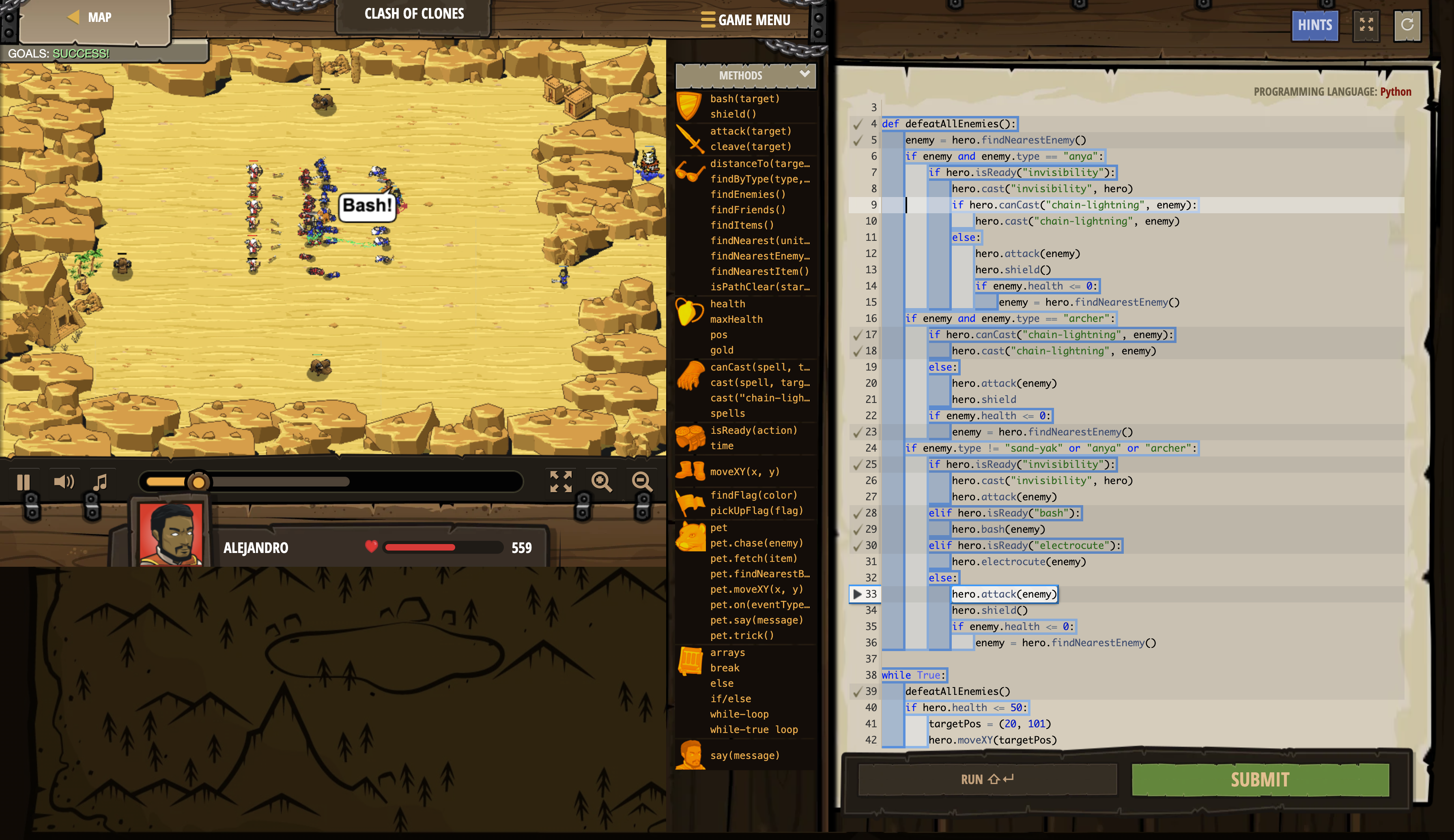 Zrzut ekranu z gry CodeCombat, z jednego z początkowych poziomów. Po prawej stronie piszemy kod sterujący bohaterem, a po lewej możemy uruchomić ten kod i zobaczyć jaki uzyskamy efekt.