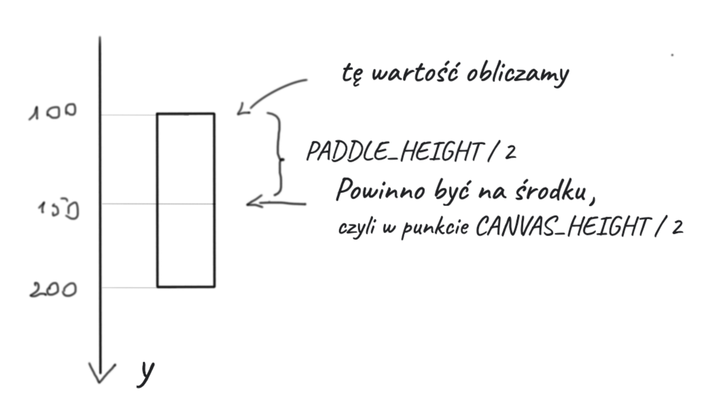 Ciekawą zmienną jest PADDLE_START_Y, która zawiera początkową pozycję y góry paletek. Chcemy umieścić je dokładnie na środku. Gdybyśmy ustawili tę wartość na CANVAS_HEIGHT / 2, to zaczęlibyśmy rysować od środka płótna w dół, a więc środek paletki znajdowałby się poniżej środka płótna. Aby dokonać korekty, musielibyśmy przesunąć tę paletkę w górę, o połowę jej wysokości. Przesunięcie w górę to odjęcie od współrzędnej, zatem moglibyśmy obliczyć poprawną wartość przez CANVAS_HEIGHT / 2 - PADDLE_HEIGHT / 2, co jest równoznaczne z (CANVAS_HEIGHT - PADDLE_HEIGHT) / 2.